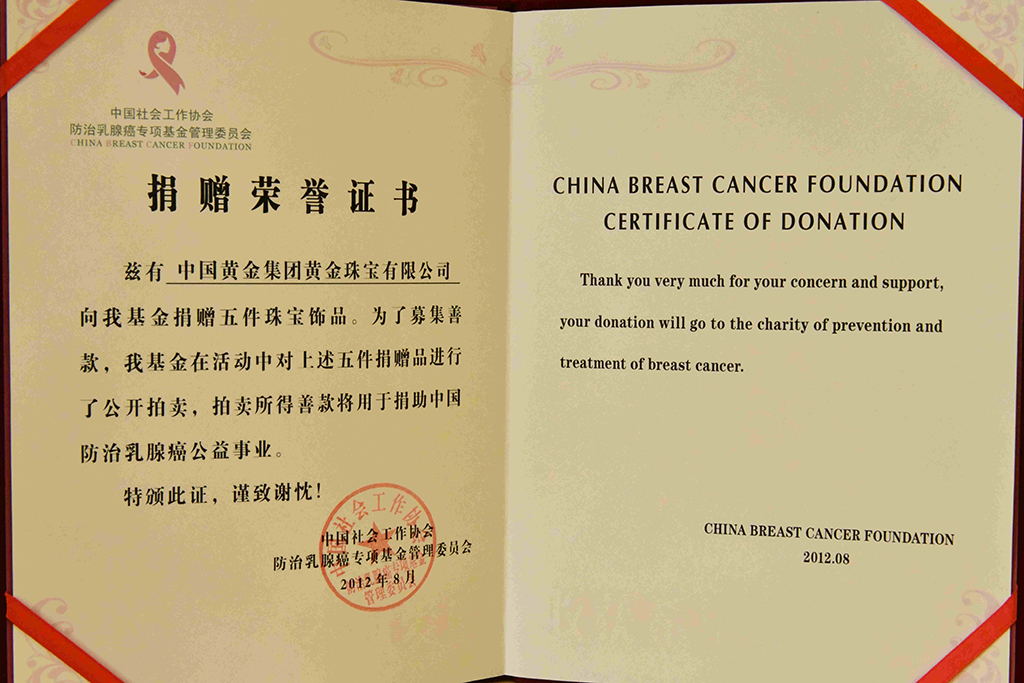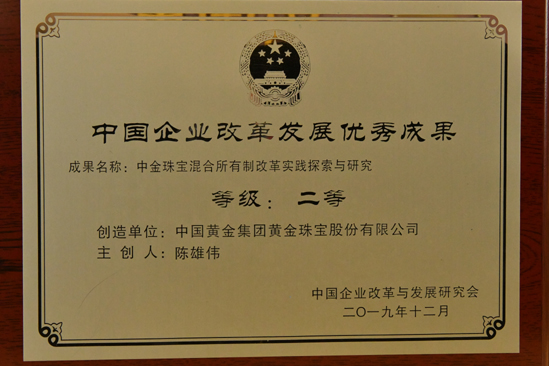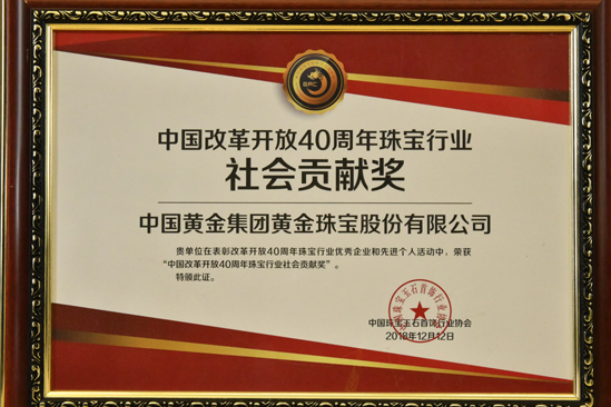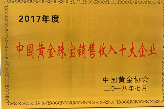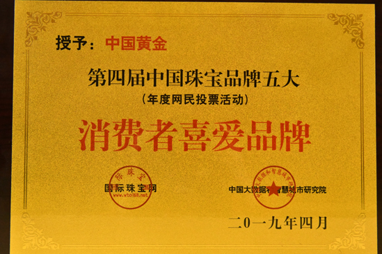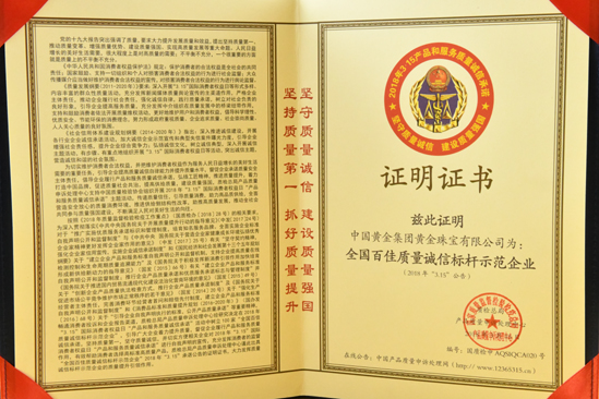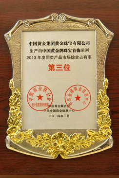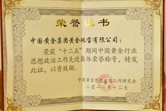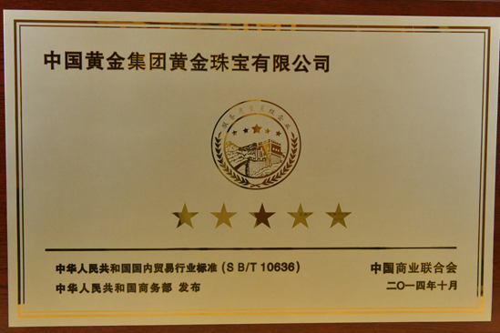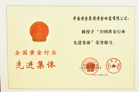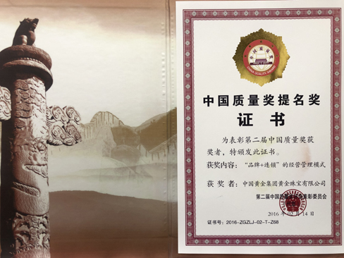 2012年被中國質(zhì)量檢驗協(xié)會評為全國質(zhì)量誠信承諾優(yōu)秀示范企業(yè)。2012年3月15日中國黃金集團黃金珠寶有限公司榮獲中國質(zhì)量檢驗協(xié)會頒發(fā)的全國質(zhì)量誠信承諾優(yōu)秀示范企業(yè)獎。