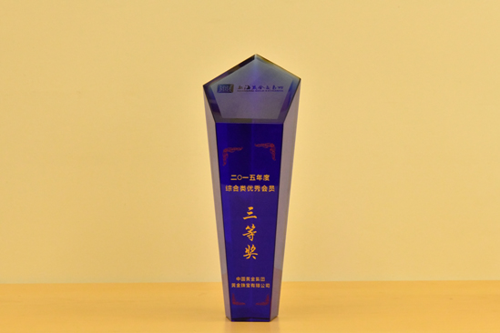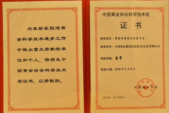 2015年,中國黃金被中國珠寶玉石首飾行業(yè)協(xié)會授予“2015年度中國黃金珠寶玉石首飾行業(yè)零售業(yè)十大品牌”。中國黃金集團黃金珠寶有限公司,科技獎項目名稱“黃金珠寶電子交易平臺”,榮獲2015年度中國黃金協(xié)會科學(xué)技術(shù)獎壹等獎,獲獎證書編號2015HJ012。