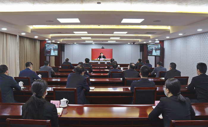 集團(tuán)公司領(lǐng)導(dǎo)班子成員在視頻分會(huì)場(chǎng)參加報(bào)告會(huì)。