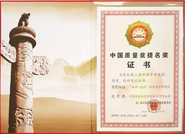 翻開品牌榮譽(yù)簿,中國黃金近年來持續(xù)獲得多個(gè)獎(jiǎng)項(xiàng):2016年獲中國質(zhì)量獎(jiǎng)提名獎(jiǎng);2021年在中國黃金珠寶盛典中,獲得“全國連鎖推薦品牌“ “百強(qiáng)金店”等多項(xiàng)榮譽(yù);2022年蟬聯(lián)我喜愛的中國品牌百強(qiáng)榜;在2024新華社、中國品牌建設(shè)促進(jìn)會、中國資產(chǎn)評估協(xié)會等單位共同發(fā)布的“中國品牌價(jià)值評價(jià)信息”中,中國黃金品牌價(jià)值蟬聯(lián)零售業(yè)前三……
