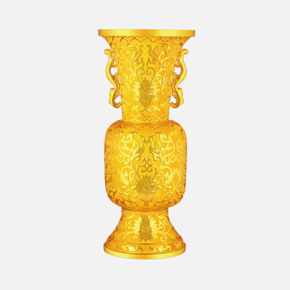 金纏枝花卉紋雙耳尊,以清中期掐絲琺瑯產(chǎn)值花卉雙耳尊為原型,侈口,筒腹,圈足,通體鏨刻纏枝花卉紋,兩側(cè)飾夔龍耳。由于此尊原型為清代宮廷陳設(shè)用器,造型又來源于商周青銅器,因此每一個(gè)細(xì)節(jié)都凸顯出皇家獨(dú)有的華貴氣質(zhì),美不勝收。