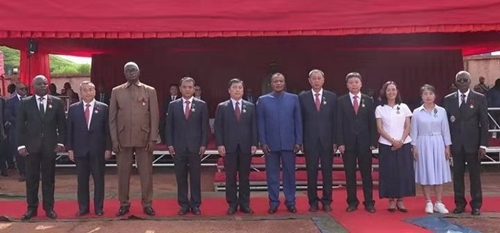 剛果(布)總統(tǒng)德尼·薩蘇·恩格索(左起第六位)親自為做出杰出貢獻(xiàn)的索瑞米公司管理人員頒授國家級勛章。
